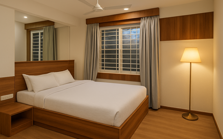 - Amenities: Air-Conditioning, Attached Bathroom, Balcony, breakfast, Desk + Chair, Geyser, Housekeeping, Induction Cooktop, Inverter Backup, Kitchenette, Lift Access, Refrigerator, Smart TV, Wardrobe, Washing Machine Access, Wi-Fi